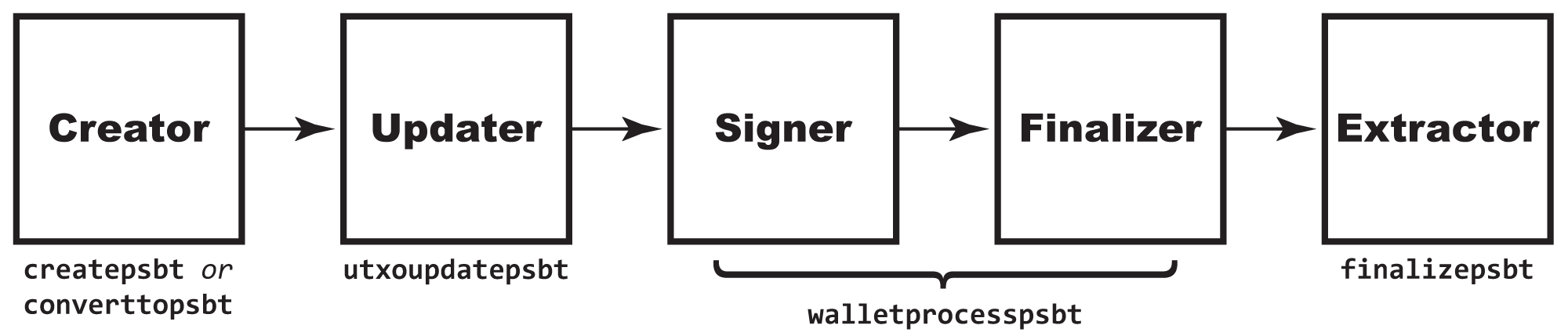 When creating bitcoin-cli software, it's most likely that you'll fulfill the five core roles of PSBTs with createpsbt, walletprocesspsbt, and finalizepsbt. Here's what that flow looks like: